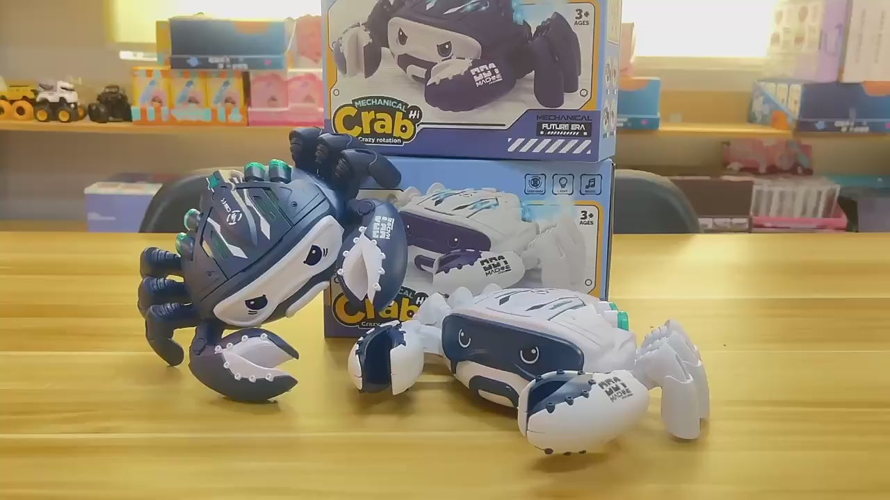 Įdėti 3 AA tipo baterijas (baterijos NEĮEINA į komplektaciją) ir įjungti krabą. Nuimkite apsauginę dalį nuo ratuko, esančio ant krabo dugno ir paleiskite žaislą. Krabas skleis muziką, vaikščios ir švies.